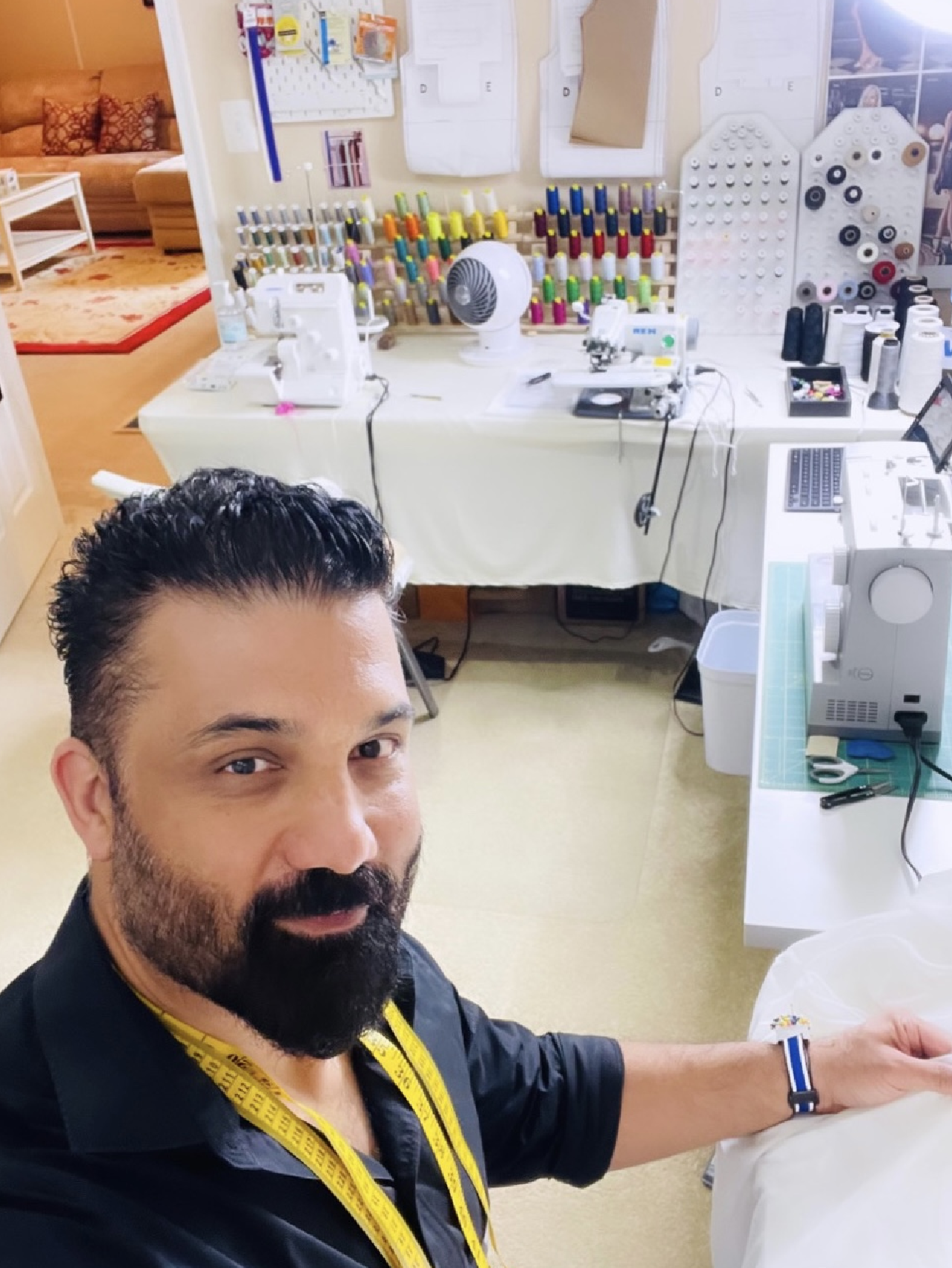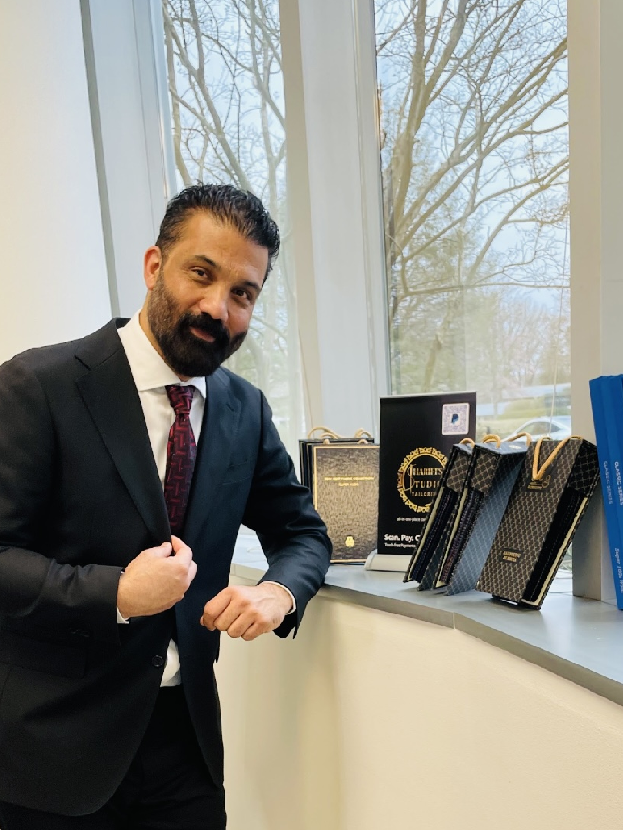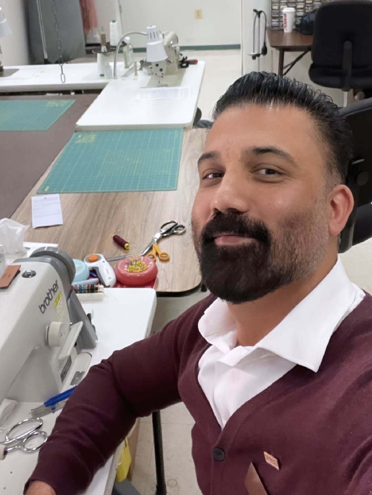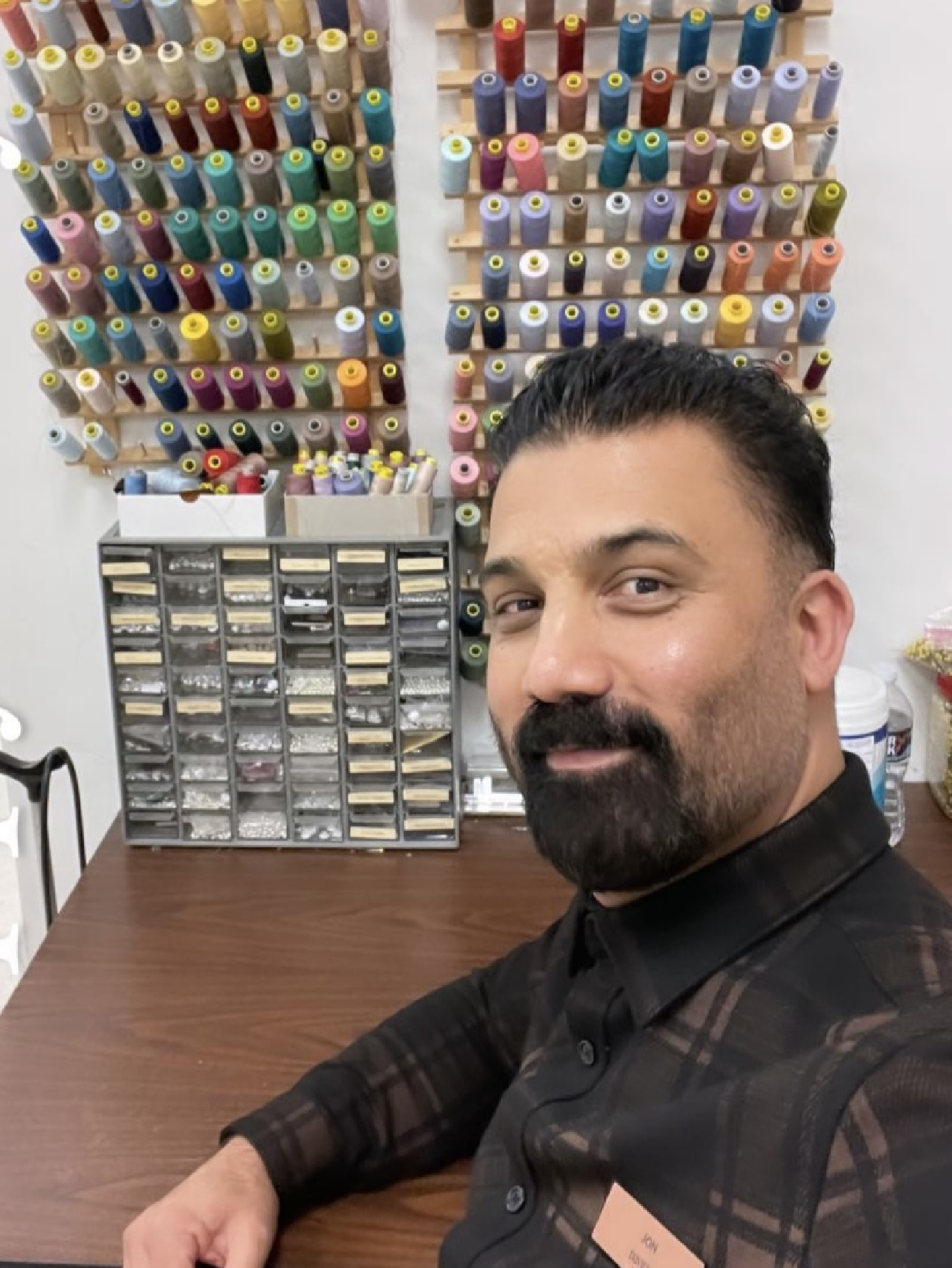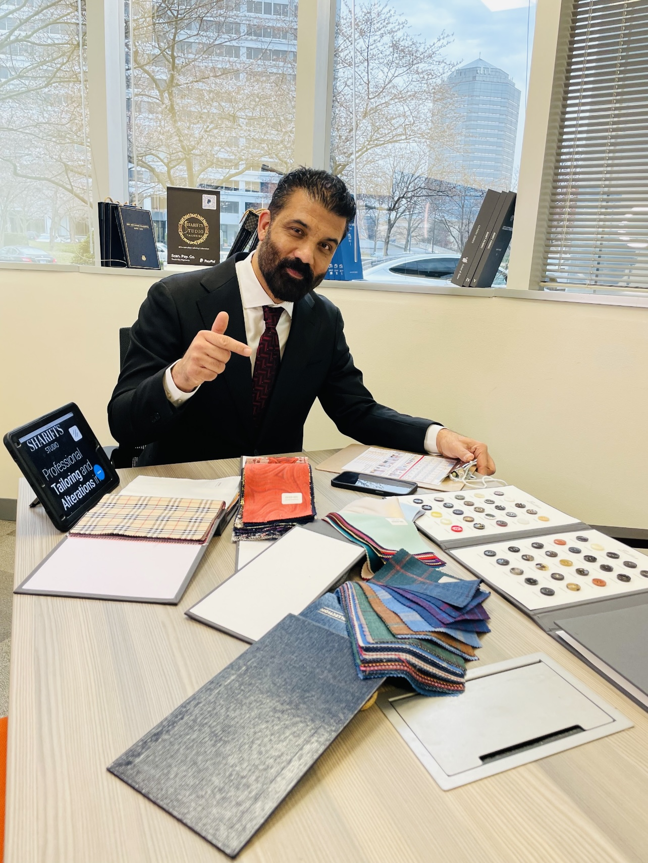 Our new customer is choosing fabrics to order 4 pairs of pants for her work.