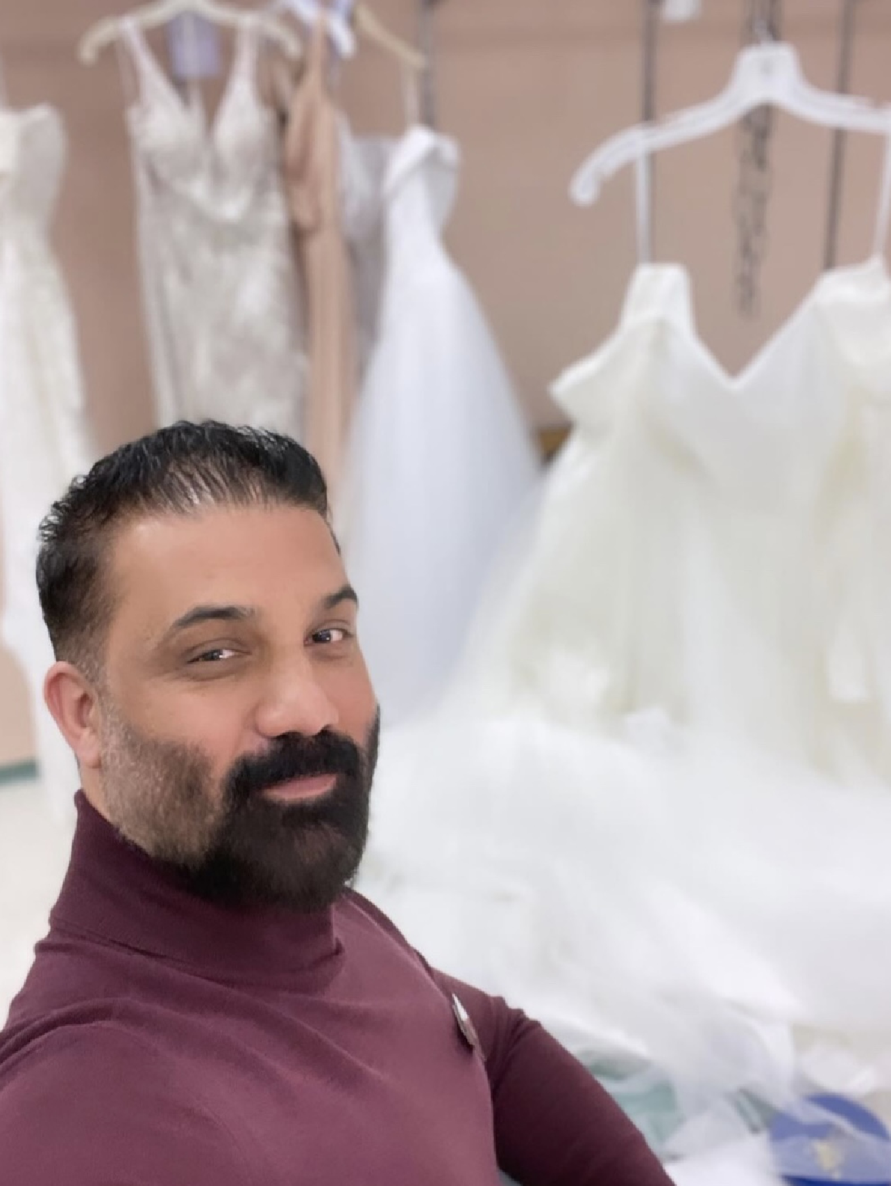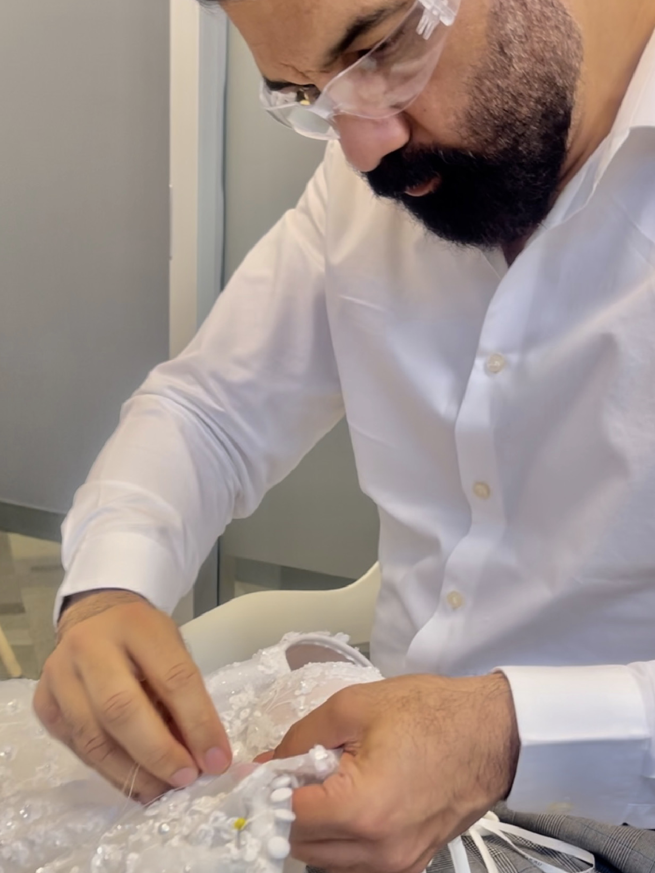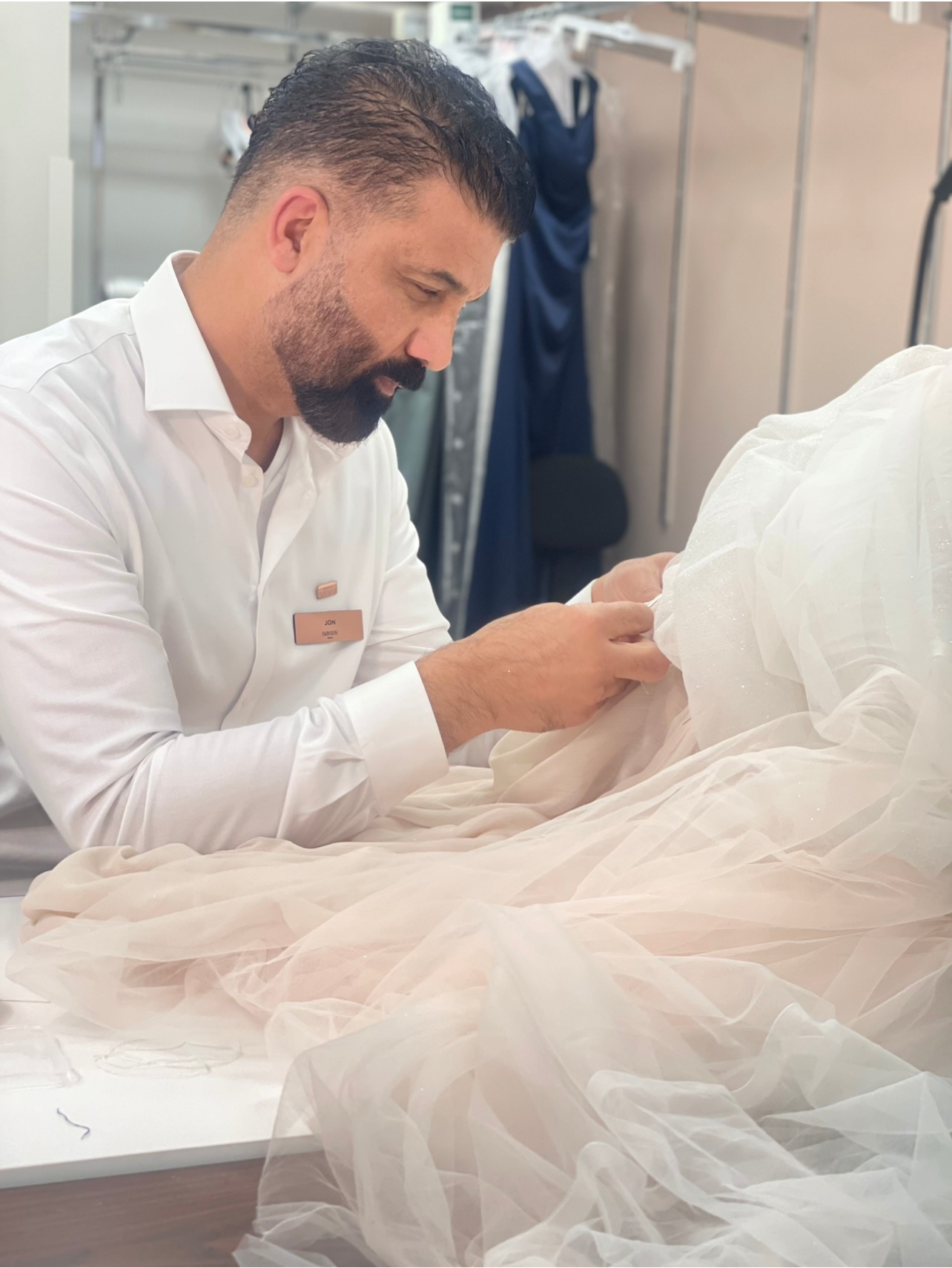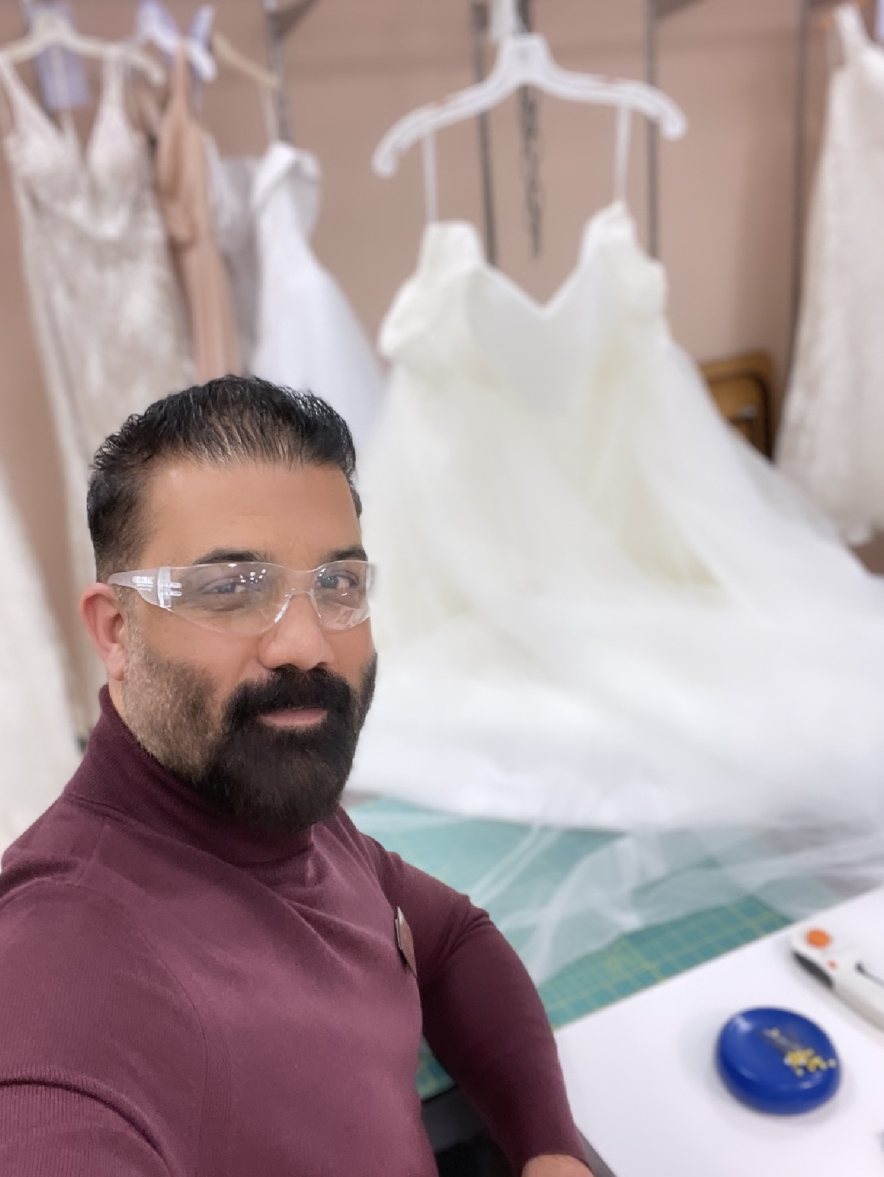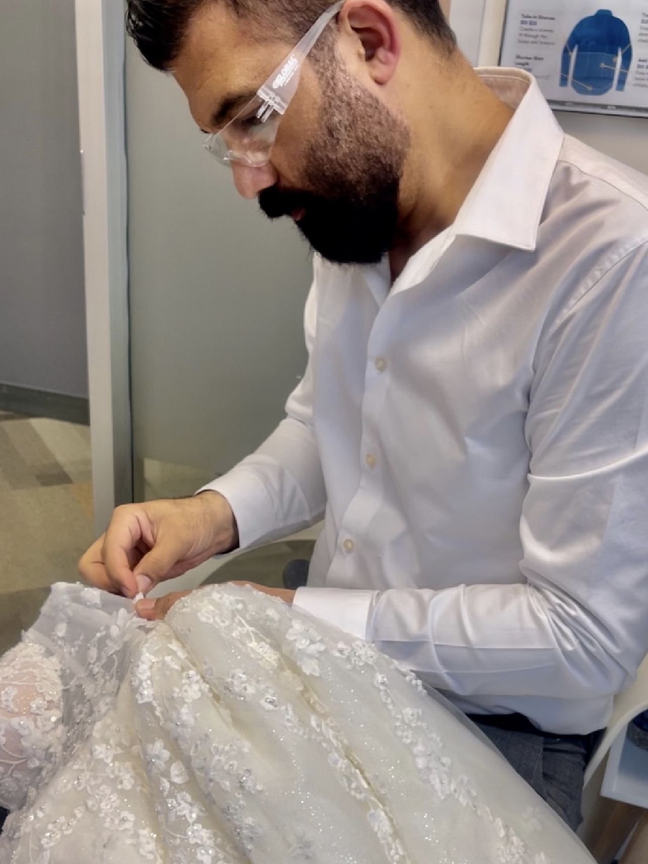 Our new customer is choosing fabrics to order 4 pairs of pants for her work.