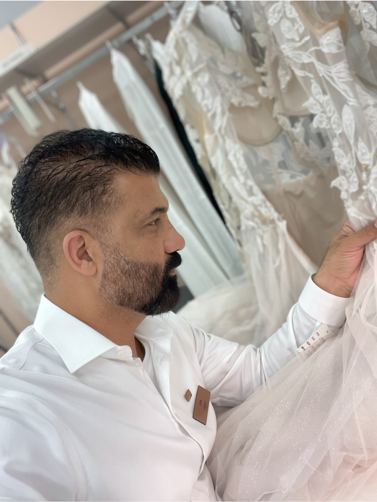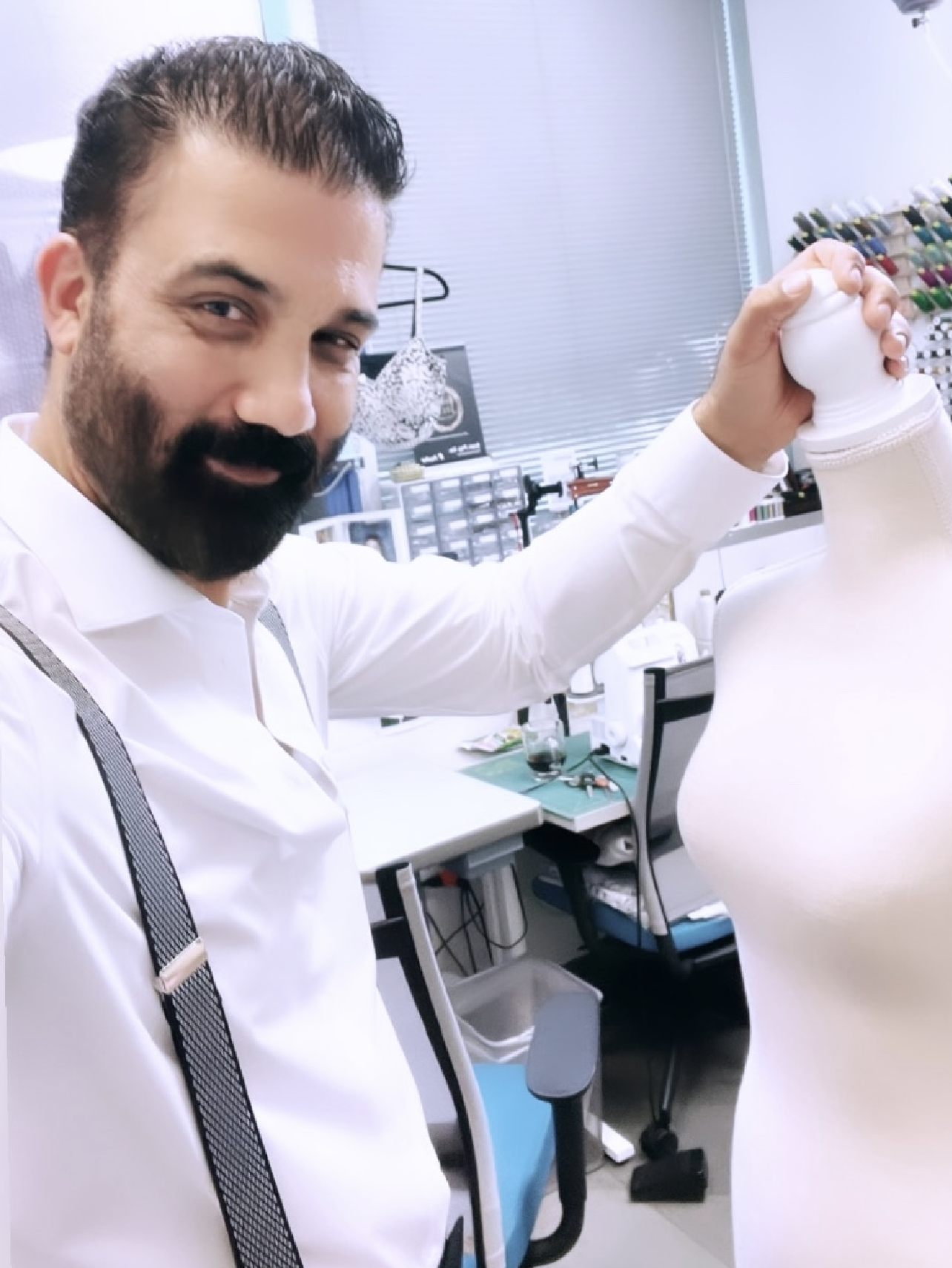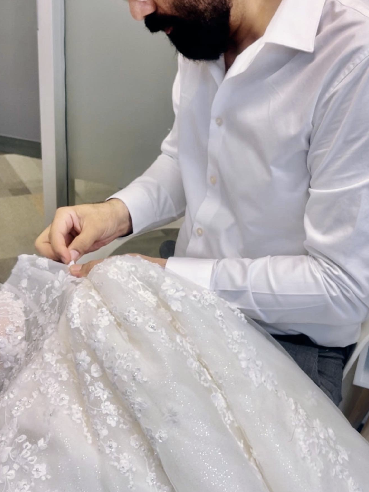 Our new customer is choosing fabrics to order 4 pairs of pants for her work.